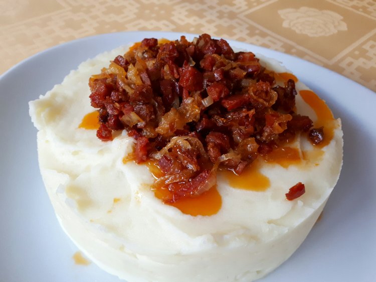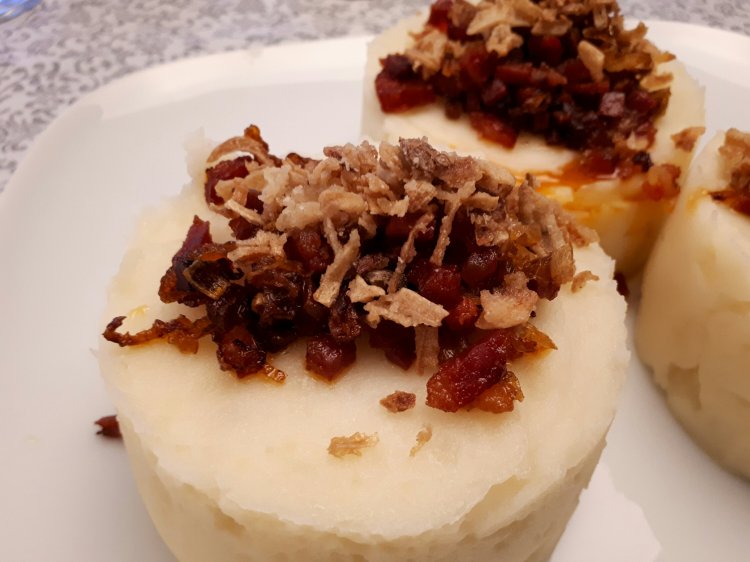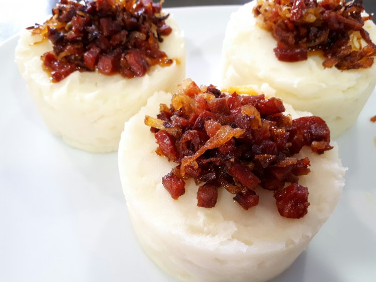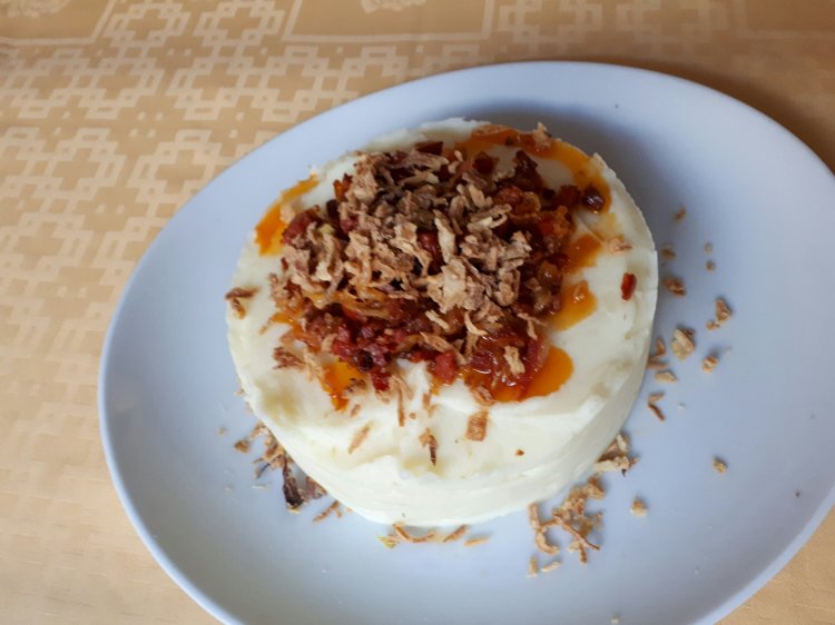 Es un puré de patata (que hice sin lactosa por los comensales que tenía!) suave y con un toque excepcional de cebolla y chorizo.
