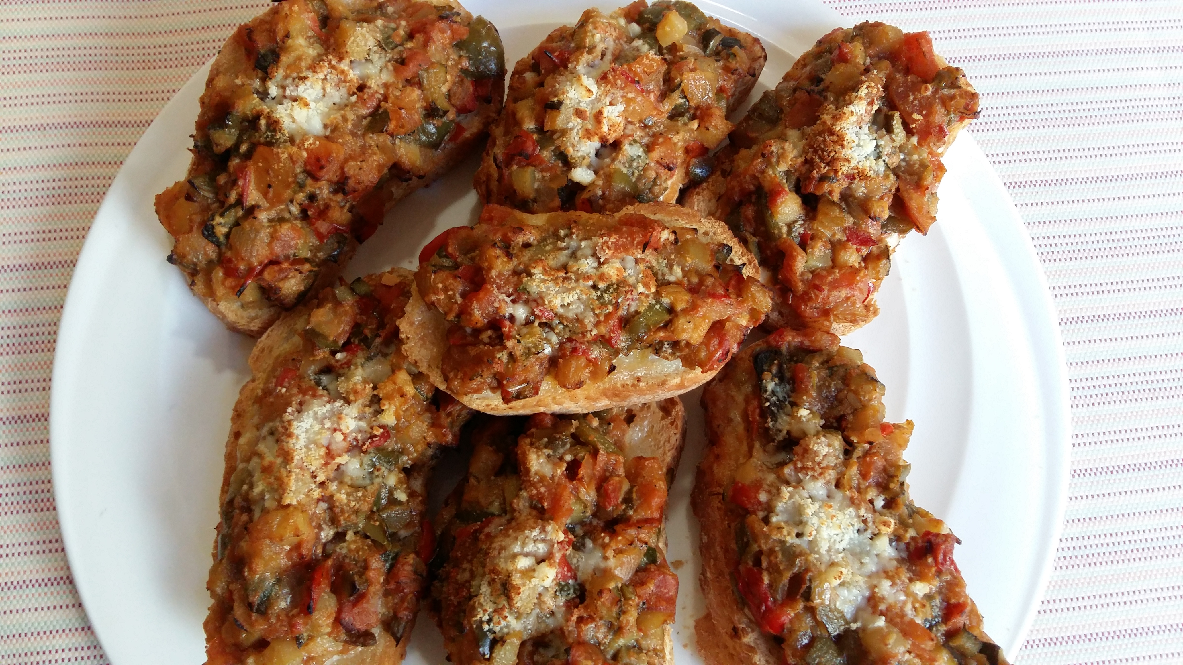 Emplatado: untar la tosta con mayonesa. Añadir el pisto (si te ha quedado demasiada agua del tomate y calabacin es bueno que lo escurras un poco). Y por último espolvorear un poco de queso parmesano. Gratinar a 190°C 5 minutos. Y ya lo tienes.