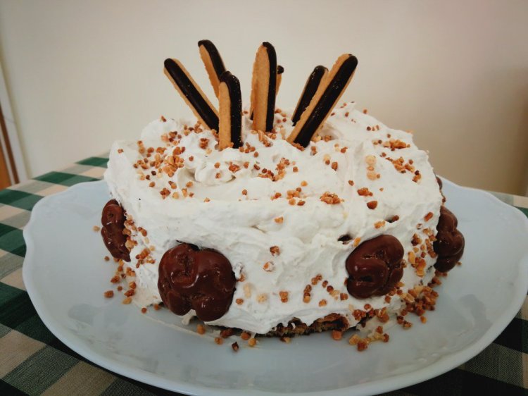 We put the moka on top of the cake, spreading it well. Make a layer not too fat because it will be too sugary in the mouth. Spread some beaten heavy cream to decorate. Extend it so that there are peaks raised. You can also leave it without peaks, as you prefer. It is important that the tart then take your personal touch, it is more enjoyable and it awakes your creativity.