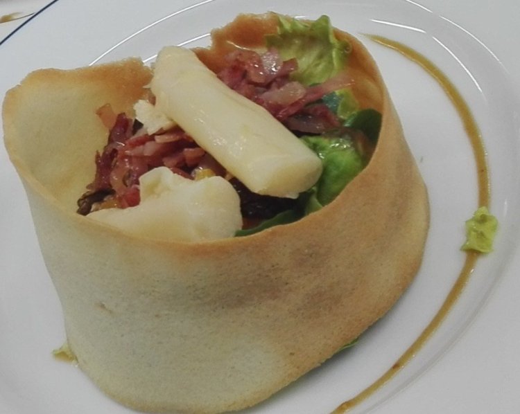En un aro colocar el aro de pasta de cigarrillo, dentro poner una base de mezclum con el aliño, añadir una cucharada de naranja con pasas (escurridas del ron) un cuchara de queso, una cucharada de frutos secos, otra de bacon y por ultimo colocar una yema de espárragos