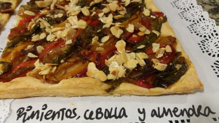 Cortamos en tiras finas los pimientos y los freímos. Por otro lado, cortamos la cebolla a juliana y la salteamos. Cuando están hechas las verduras y la cebolla las distribuimos encima del hojaldre estirado y lo coceremos. En una sartén, calentamos la almendra y la ponemos por encima de la coca una vez haya salido del horno.