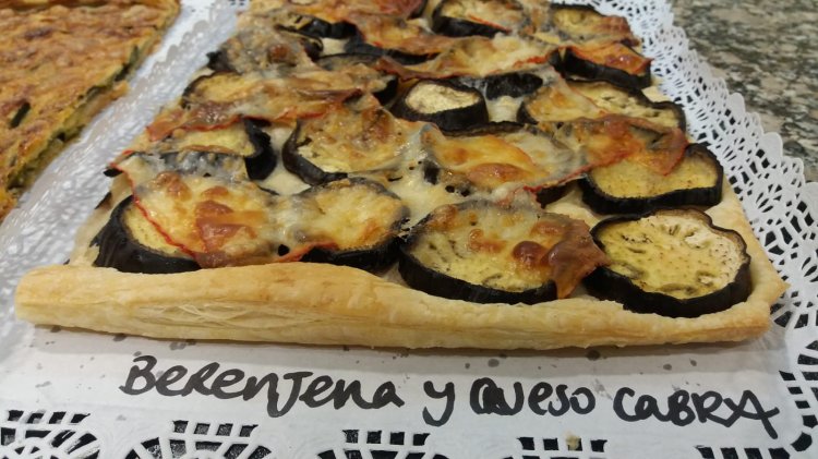 Cortamos la berenjena a rodajas y la asamos en el horno. Extendemos el hojaldre como en la anterior coca y ponemos la berenjena y las lonchas de queso. Cocer