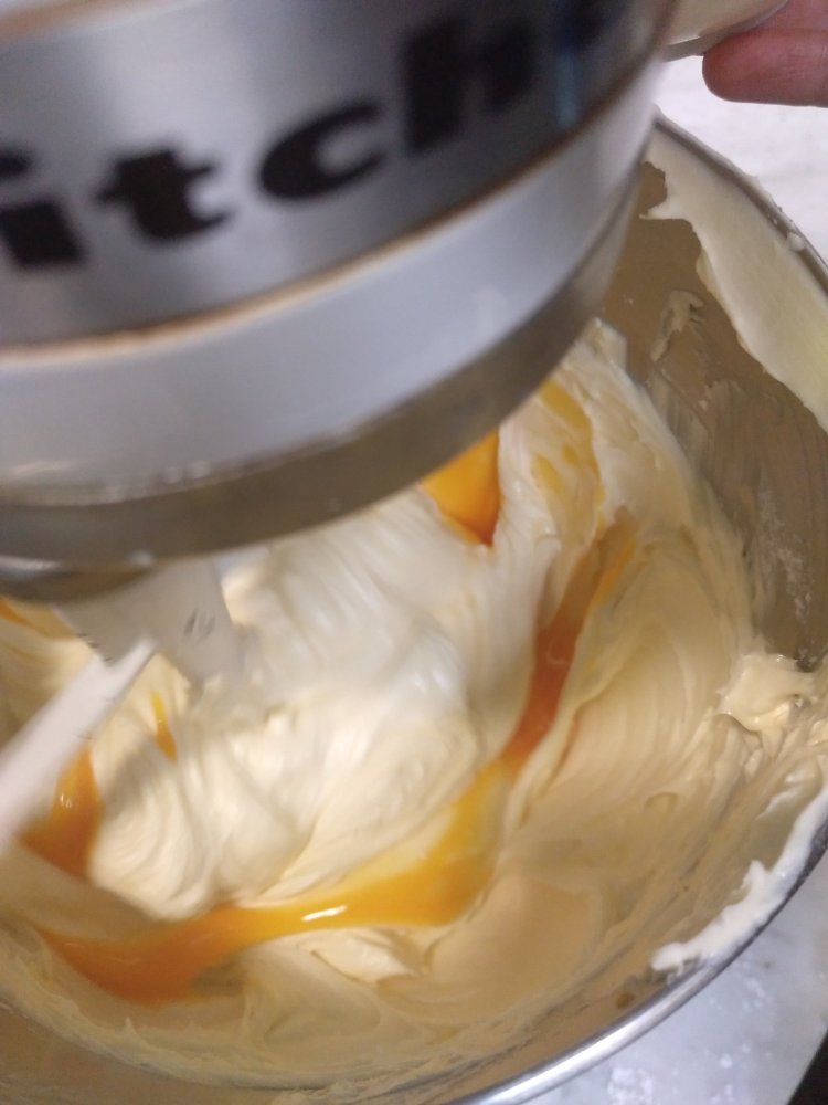 Add the powdered sugar to the butter and continue whisking until you get a whitish yellow mixture.