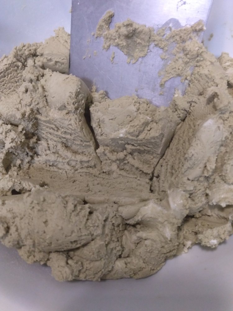 Cuando la masa esté unificada, cortar la masa en trozos con la espátula y volver a amasar.