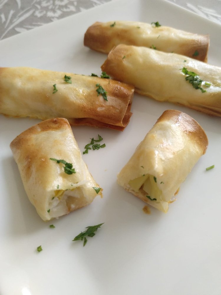 Hacemos rollitos con la mezcla. En este caso hemos utilizado hojas de masa de rollito de primavera cortadas por la mitad pero también se pueden utilizar obleas de empanadilla.