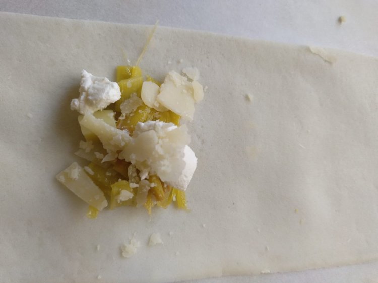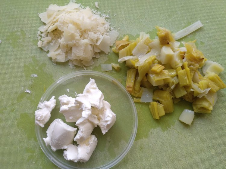 Lavamos y cortamos la parte blanca de los puerros en rodajas finas y lo salteamos en la sartén con el aceite caliente. Cuando esté bien pochado salpimentamos y fuera del fuego añadimos el queso troceado y el queso rallado. Mezclamos bien.