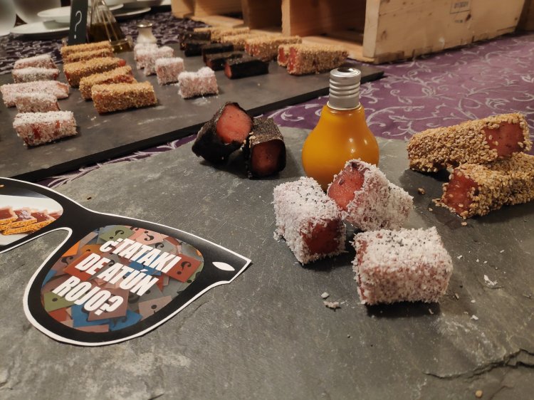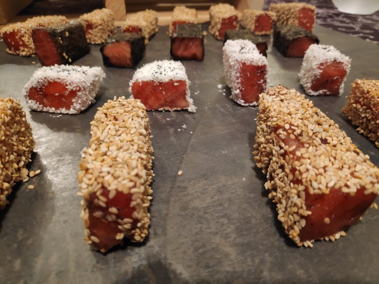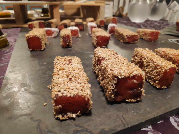 Otro posible trampantojo es este.. Tataki de atún!…. Que en realidad es sandía. Simplemente, tienes que cortar la sandía en forma de lomos de atún y dejarla en remojo con zumo de frutos rojos: arándanos, grosellas… A continuación, rebozarlo en sésamo. El resultado es tan parecido que solo al paladar se descubren sus ingredientes…