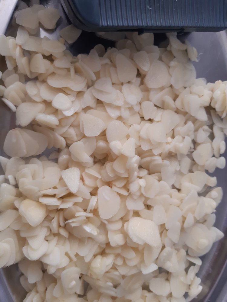Ajo laminado frito- laminamos el ajo con mandolina (tambien se puede cortar a mano). Ponemos aceite a calentar hasta que alcance los 40° y añadimos el ajo.(el aceite puede ser una parte de aceite intenso y media de suave= esto es opcional). Vamos moviendo hasta conseguir el color tostado que deseamos…teniendo en cuenta que después de sacarlo del fuego siempre coge un poco de color mas por el calor residual.