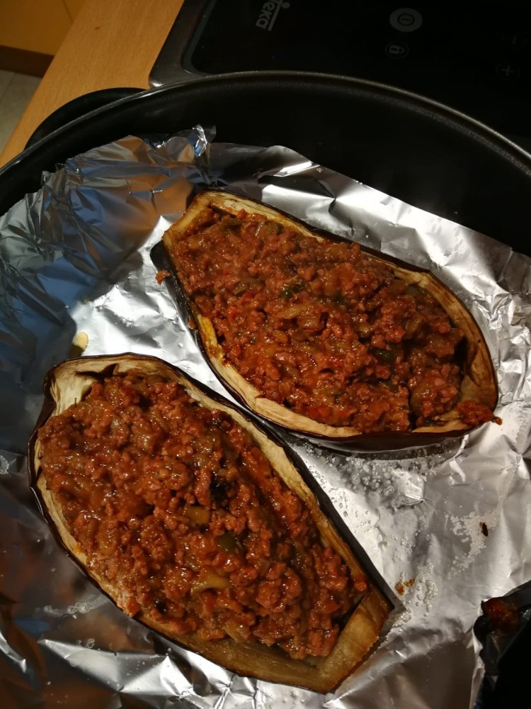 Solo te queda rellenar las berenjenas, ponerles por encima un poco de queso para gratinar y pan rallado (conseguiremos una costra en la