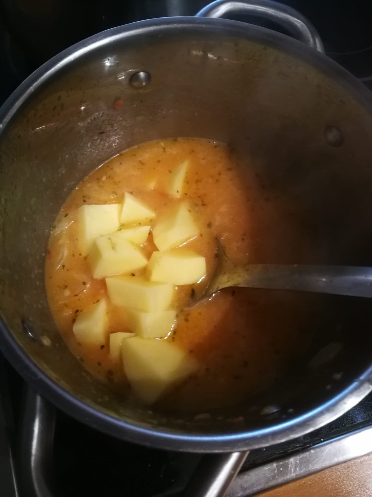 Añadir 500ml aprox de fumet y dejarlo cocer 20 minutos con las patatas cortadas a cascos, y las judías cortadas al vies.